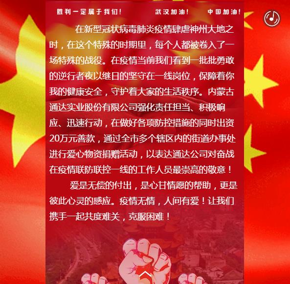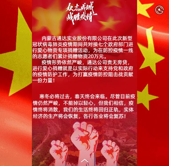 內(nèi)蒙古通達實業(yè)股份有限公司在此次新型冠狀病毒肺炎疫情期間共對接7個政府部門進行愛心物資專項捐贈活動,為在防控疫情一線的志愿者們累計捐贈20萬元。