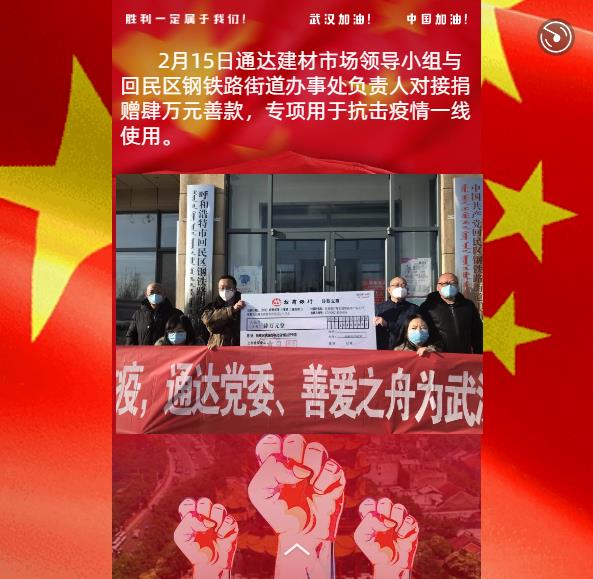 在新型冠狀病毒肺炎疫情肆虐神州大地之時,在這個特殊的時期里,每個人都卷入了一場特殊的戰(zhàn)役。在疫情當(dāng)前我們看到一批批勇敢的逆行者夜以繼日的堅守在一線崗位,保障著你我健康安全,守護者大家的生活秩序。內(nèi)蒙古通達實業(yè)股份有限公司強化責(zé)任擔(dān)當(dāng)、積極響應(yīng)、迅速行動,在做好各項防控措施的同時出資20萬元善款,通過全市多個轄區(qū)內(nèi)的街道辦事處進行愛心物資捐贈活動,以表達通達公司對奮戰(zhàn)在疫情聯(lián)防聯(lián)控一線的工作人員最崇高的敬意!
