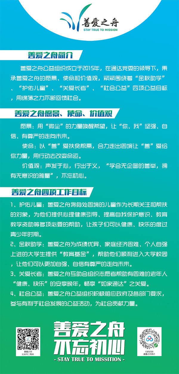 關(guān)注善愛之舟公眾號(hào),點(diǎn)擊菜單欄助學(xué)報(bào)名——助學(xué)報(bào)名通道,閱讀助學(xué)海報(bào)了解善愛之舟及2020年善愛之舟金秋圓夢公益助學(xué)說明